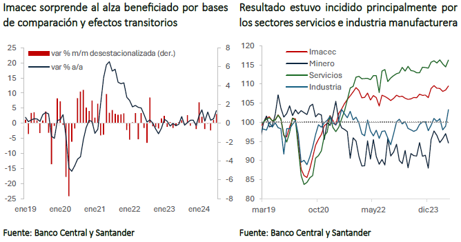 Imacec sorprende al alza en julio (4,2% a/a vs. Bloomberg: 2,7%; Santander: 3,3%), incidido principalmente por los servicios (5,3% a/a), debido al efecto del adelantamiento de las vacaciones escolares que implicaron una semana más de clases en julio, y por el transporte. A esto se suma el crecimiento del sector manufacturero (7,8% a/a) con un impulso aún mayor al que adelantaban las cifras sectoriales publicadas por el INE, también apuntando al dinamismo pesquero.