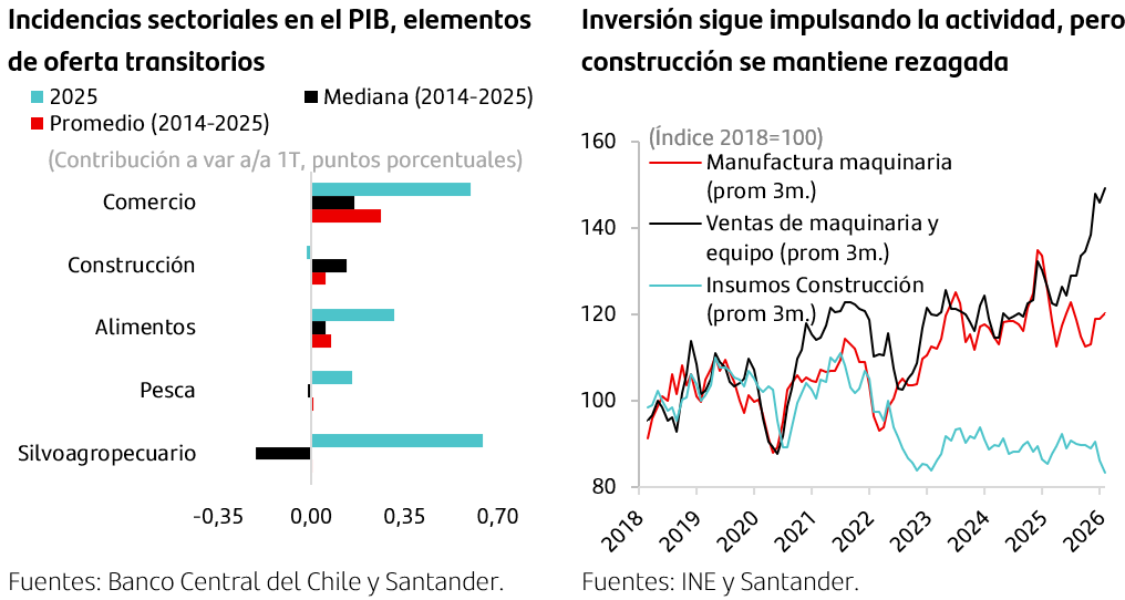 Parte de esta dinámica ya la anticipábamos, considerando que a comienzos de 2025 se registraron factores de oferta transitorios vinculados a sectores exportadores, como la producción frutícola, la pesca y la industria de alimentos, que impulsaron al sector agropecuario-silvícola, la industria y el comercio mayorista. Estos efectos no se repetirían este año, generando una base de comparación más exigente, a lo que se suma el menor desempeño de la producción minera. Con esta información, estimamos un crecimiento del Imacec de febrero entre 0% y 0,5% a/a.