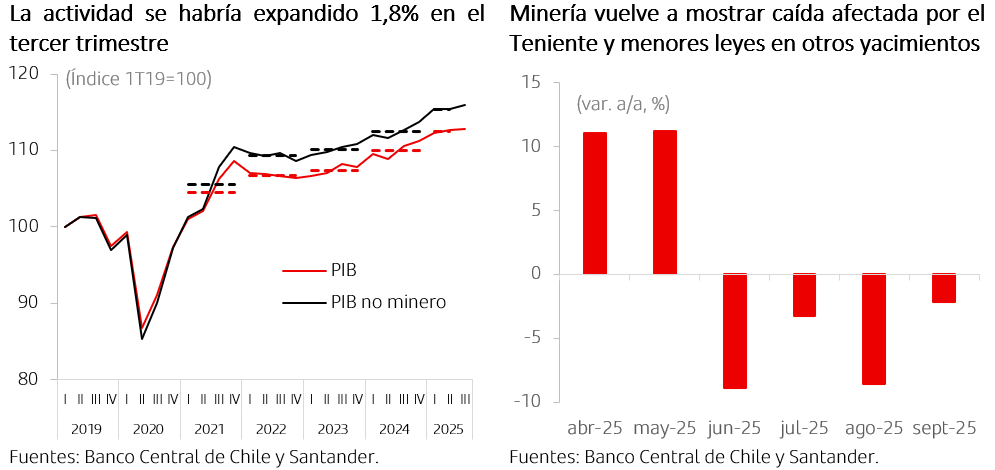Estas cifras preliminares sugieren que el PIB habría crecido 1,8% anual en el tercer trimestre y 2,7% al excluir la minería. En términos desestacionalizados, la actividad habría aumentado 0,1% trimestral. Si bien aún resta conocer el detalle de las Cuentas Nacionales, que se publicarán el martes 18 de noviembre, este dato preliminar es menor a la proyección del último IPoM (2,45% para el 3T2025). Con todo, mantenemos nuestra estimación de 2,4% para el conjunto del año.