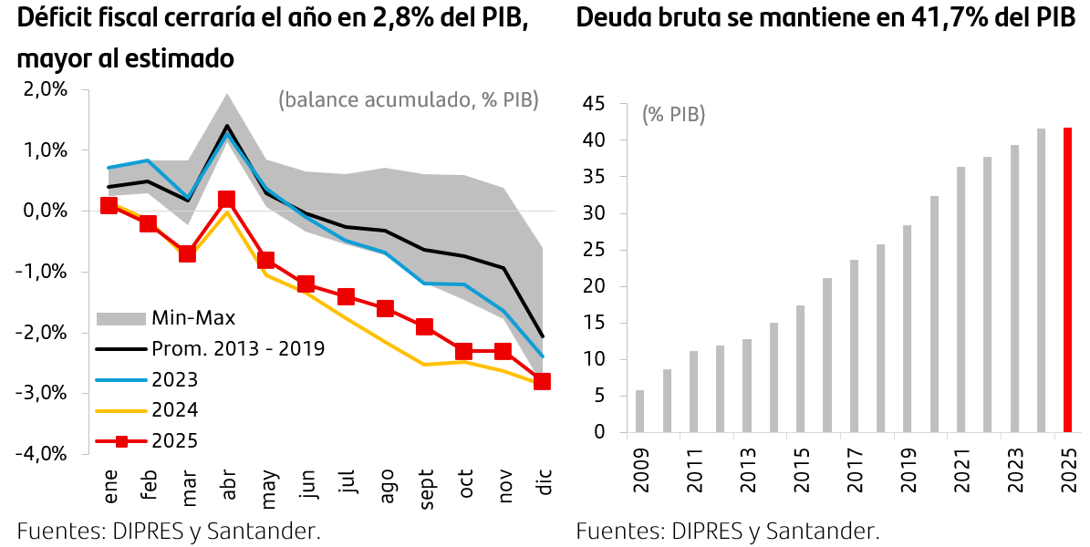 Así, el balance fiscal cerró el año con un déficit de $9,5 billones, un 45% por sobre el estimado en el último IFP. Esto representa un 2,8% del PIB, superando el 2,0% del PIB previsto en el informe y nuestra proyección de 2,5% del PIB. Al mismo tiempo, la deuda bruta se mantuvo en 41,7% del PIB estimado, beneficiada por la corrección al alza en el producto nominal estimado y la apreciación del tipo de cambio.