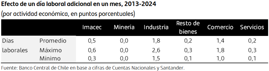 Los resultados de septiembre deben analizarse con cautela, ya que el mes tuvo dos días hábiles adicionales respecto al año anterior. Además, en 2024 la existencia de tres feriados consecutivos contiguos a un fin de semana amplificó el efecto calendario. Con todo, y considerando estos factores, estimamos que el Imacec de septiembre habría crecido en torno a 4% interanual, impulsado principalmente por el efecto calendario positivo y por el buen desempeño del comercio y servicios personales.
