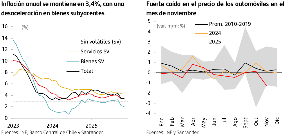 El IPC sin volátiles aumentó 0,2% m/m, con una variación anual de 3,4%, ubicándose ligeramente por debajo de nuestras expectativas. Este comportamiento respondió principalmente al componente de bienes, que no mostró vaivenes (0,01% m/m; 2,0% a/a). Dentro de este grupo, destacó la caída en el precio de los automóviles nuevos (–1,27% m/m), el menor registro histórico para un mes de noviembre, reflejo de una demanda aún débil para este producto y de la apreciación del tipo de cambio.