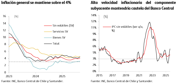 El IPC sin volátiles se empinó 0,4% m/m, con una variación anual de 3,9% (3,9% en agosto). Dentro de sus componentes, los bienes sin volátiles subieron 0,6% m/m (3,2% a/a), mientras que los servicios sin volátiles avanzaron 0,2% m/m (4,5% a/a), reflejando una estabilidad en las presiones subyacentes. Dentro del componente de bienes, destaca que los alimentos, en los últimos meses, se mantienen creciendo por sobre el promedio histórico. Con todo, la velocidad del componente sin volátiles (tasa de variación mensual de los últimos tres meses) continúa elevada.