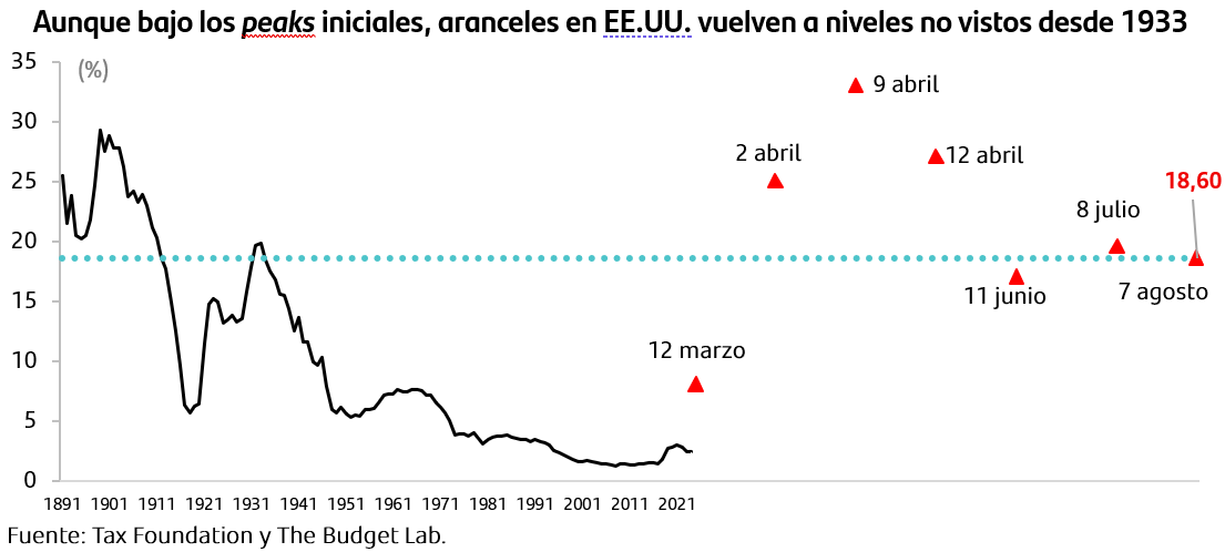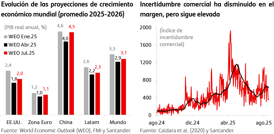 Si bien se descartaron los escenarios de mayores riesgos, los anuncios representan niveles de tarifas significativamente más altas que a comienzos de año. Aunque el arancel promedio ha retrocedido desde sus máximos recientes, continúa en niveles históricamente elevados (18,6%), lo que evidencia que la política comercial estadounidense será más restrictiva que lo observado durante buena parte del siglo pasado. Sin embargo, en medio del alivio por los acuerdos alcanzados, organismos internacionales como el FMI, en su último reporte de Perspectivas Económicas Globales de julio, elevó sus proyecciones de crecimiento mundial a 3,0% para este año y 3,1% para el próximo (desde 2,8% y 3,0% previamente). Esta mejora responde, principalmente a la disminución del riesgo de una guerra comercial a gran escala. No obstante, la institución advirtió que, si bien los efectos negativos internacionales han sido relativamente acotados hasta ahora, los costos más significativos de la estrategia arancelaria recaerían sobre la propia economía estadounidense.