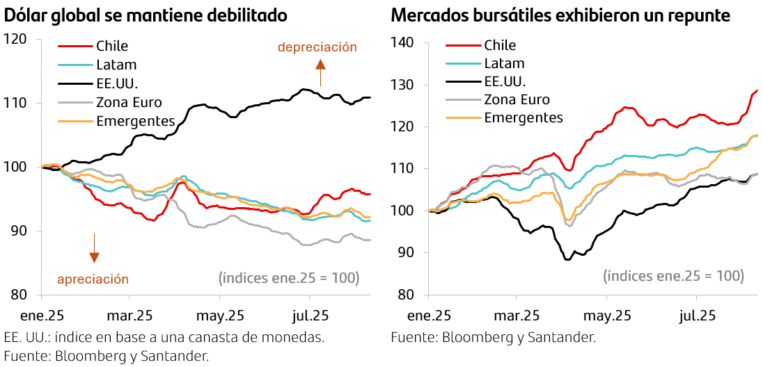 Resiliencia de la economía china. Los estímulos económicos por parte de las autoridades y una evolución favorable del comercio exterior —pese a las tensiones con EE.UU.—, dieron como resultado un desempeño algo mejor al previsto (PIB 2T25: 5,2% a/a vs. 5,1% esperado). Ello, sumado a la tregua arancelaria con EE. UU., gatilló una corrección al alza en las perspectivas de crecimiento por parte del mercado y de organismos internacionales (FMI: desde 4,0% a 4,8% para 2025, en su informe de julio). No obstante, aún existen riesgos, como los deflacionarios (IPP de julio: -3,6% a/a vs. -3,3% esperado), que siguen presentes.