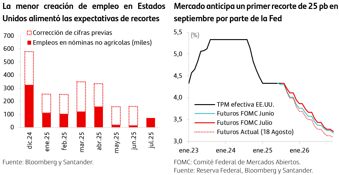 La pérdida de dinamismo laboral reforzó las expectativas de recortes de la Fed. En su última reunión, la Reserva Federal mantuvo el rango de la tasa de referencia sin cambios, aunque con un Comité dividido y manteniendo un tono de cautela. Las cifras de inflación que se publicaron después dieron señales mixtas. Por un lado, el mercado celebró un IPC de julio alineado en gran medida con las expectativas (manteniendo 2,7% en términos anuales), pero por otro, los precios al productor sorprendieron al alza acotando el optimismo (0,9% m/m vs. 0,2% esperado, con la variación anual escalando hasta 3,3% desde 2,4% previo). Con todo, el mercado priorizó las señales de enfriamiento laboral y todavía se descuenta —con una probabilidad superior al 80%— un recorte en septiembre y otro adicional en diciembre. Dado el tono de cautela extraído de la última Minuta, mantenemos la visión de solo un recorte al cierre de año, sin embargo, no descartamos la posibilidad de que se adelante a la reunión de septiembre.