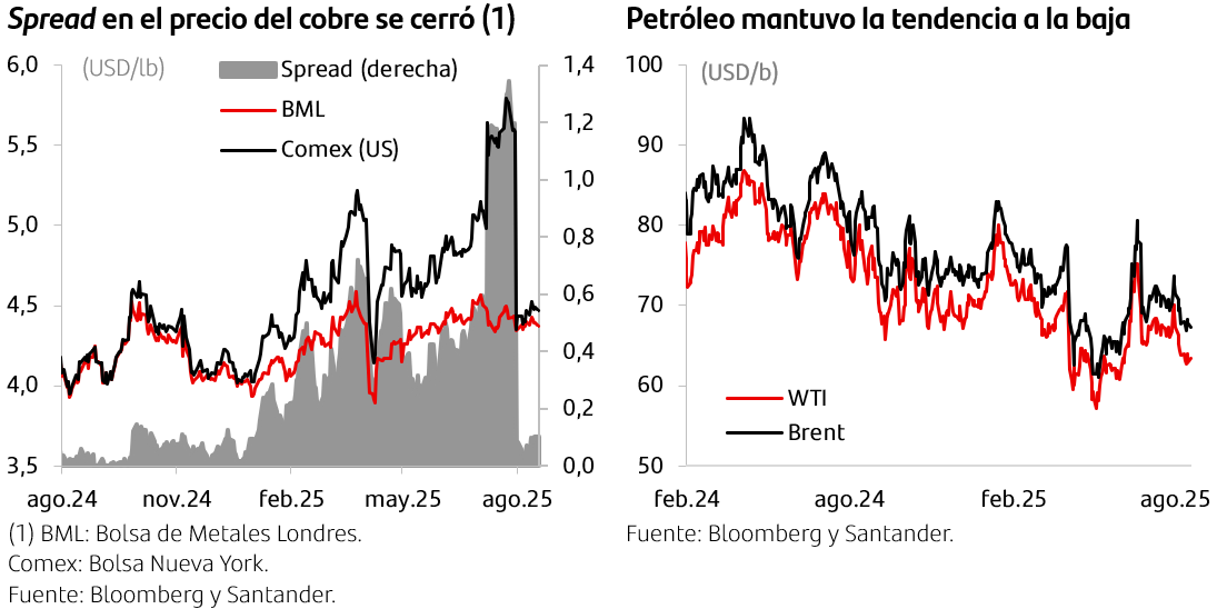 Elevamos marginalmente nuestra proyección del precio del cobre para este año y mantenemos nuestra visión para el del petróleo. Luego de que se excluyera al cobre del arancel de 50% anunciado por EE. UU., el diferencial del precio entre Londres y Nueva York se eliminó por completo. La cotización internacional retrocedió más de 20% en Comex, hasta estabilizarse en torno a los USD 4,4 la libra al cierre de este informe, convergiendo así las referencias entre ambas bolsas. En este contexto, elevamos levemente nuestra proyección promedio de USD 4,2 la libra a USD 4,3 la libra para 2025 y mantenemos USD 4,2 la libra para 2026. Por su parte, el petróleo WTI retrocedió más de 5% el último mes, ubicándose en torno a USD 62 el barril, mientras el petróleo Brent se negocia cerca de USD 67 el barril (-4% mensual), tras la desescalada de los conflictos en Medio Oriente. Por ahora, continúa sin cambios nuestra proyección de precio promedio para el WTI en USD 67 el barril en 2025 y USD 62 el barril en 2026.
