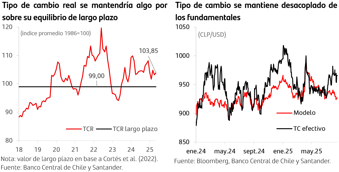 Tipo de cambio seguiría entorno a los niveles actuales. Tras la depreciación registrada desde inicios de julio —cuando el tipo de cambio rondaba los 930 CLP/USD—, el valor nominal se ha estabilizado en torno a 970 CLP/USD. Este nivel se ubica aproximadamente 40 CLP/USD por encima de la estimación de nuestro modelo de fundamentos. No obstante, proyectamos que hacia fin de año el tipo de cambio cerrará en 970 CLP/USD, en la medida que se disipe el efecto transitorio y el diferencial de tasas a dos años se reduzca gradualmente.