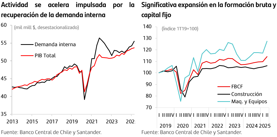 Demanda interna sustenta el crecimiento, destacando el dinamismo de la inversión asociada a grandes proyectos. Demanda interna exhibe una sólida expansión en el margen (2,4% t/t desestacionalizado), con lo que la variación anual se eleva hasta 5,8% a/a. En esto destacó el avance de la formación bruta de capital fijo (FBCF) con un crecimiento interanual de 5,6%, impulsado por el componente de maquinaria (11,4% a/a) y en menor medida por la construcción (2,0% a/a). Esta expansión responde, de manera importante, a la ejecución de proyectos de gran envergadura en minería, energía y suministro de agua. No obstante, la inversión en edificación continúa rezagada, con caídas tanto en su componente habitacional como no habitacional.