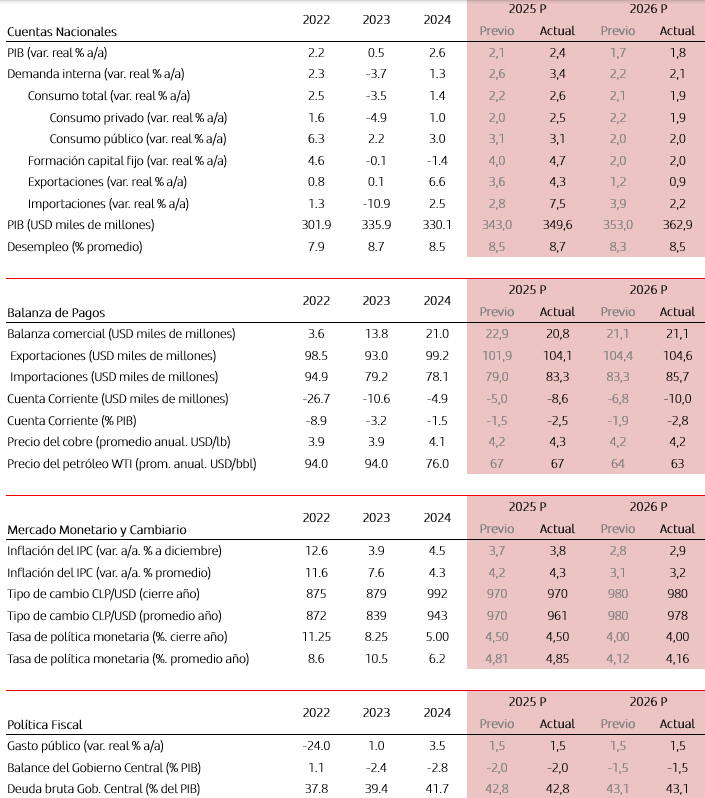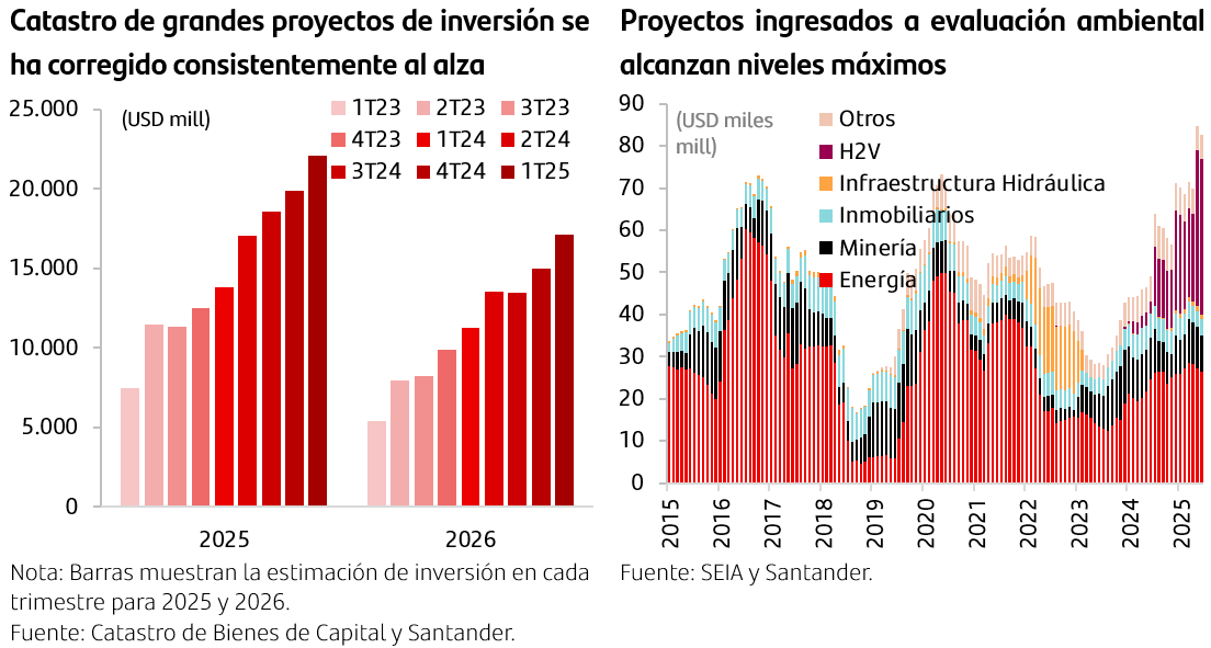 Mejores resultados en el primer semestre y positiva perspectiva para la inversión nos hacen corregir al alza nuestra proyección del año. Las cifras del primer semestre han resultado por sobre lo esperado, en parte impulsados por factores transitorios, dejando en mejor posición a la actividad para el resto del año. Por otra parte, las perspectivas para la inversión han ido mejorando, destacando una nueva corrección al alza en el catastro de la CBC tanto para este ejercicio como para el próximo. Adicionalmente, la entrada de proyectos a evaluación ambiental está en niveles históricamente altos. Con todo, ajustamos al alza nuestra proyección del PIB para este y el próximo año hasta 2,4% y 1,8% (desde 2,1% y 1,7% previos). En la misma línea, para 2025 corregimos al alza el consumo (2,5% desde 2,0%) y la FBCF (4,7% desde 4,0%).