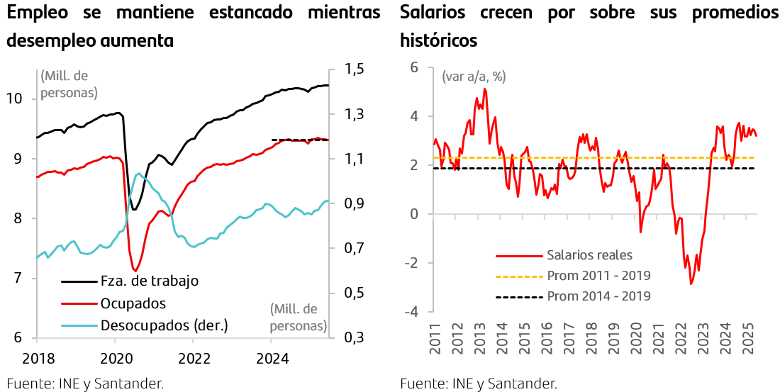 Mercado laboral se debilita ante un empleo estancado y desempleo elevado. Por una parte, el empleo se mantiene prácticamente sin cambios en el último año, dando cuenta de que la recuperación en la actividad no se ha traducido en una aceleración en la creación de empleos. Esto, sumado a una recuperación de la fuerza de trabajo, llevaron a la tasa de desempleo a mantenerse en 8,9% en términos desestacionalizados. Hacia delante estimamos que la tasa de desempleo irá disminuyendo dado su rezago respecto de la actividad, pero en nuestra visión se mantendrá en niveles elevados dado que el desempleo estructural de la economía es más alto que en la década pasada, donde según la última estimación del Banco Central se ubicaría entre 8,0% y 8,5%.