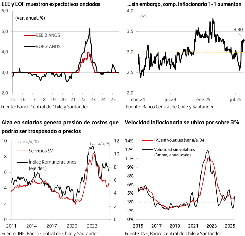 Banco Central aplazaría el nuevo recorte de tasas a diciembre. Si bien consideramos que existe el escenario para continuar con el proceso de normalización monetaria en octubre, las sorpresas al alza en el componente subyacente de la inflación y eventuales presiones de demanda o costos por aumentos de remuneraciones podrían levantar notas de cautela. Esto se da en un contexto donde la demanda ha sorprendido al alza, y con una brecha prácticamente cerrada. Así, consideramos que el nuevo recorte en la Tasa de Política Monetaria se aplazaría a diciembre (previamente estimábamos que se daría en octubre), para terminar el año en 4,5%.