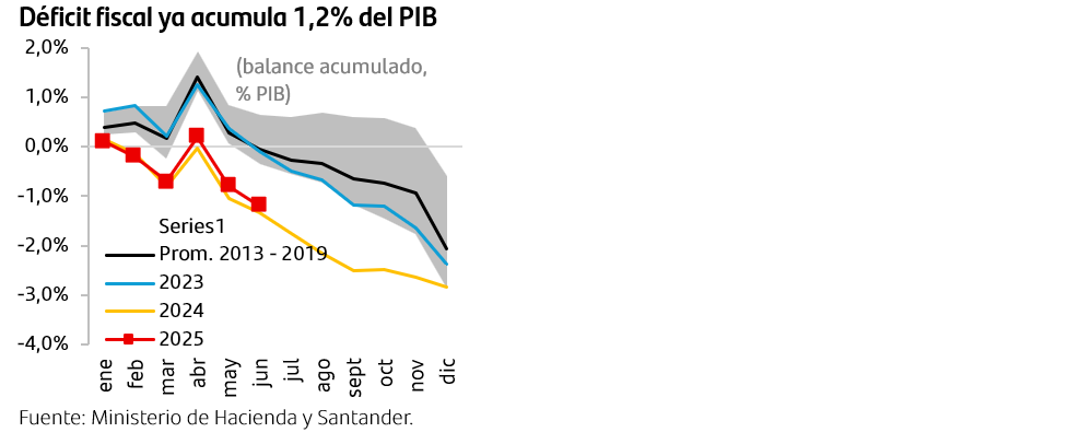 Difícil escenario para alcanzar la proyección oficial de un déficit efectivo de 1,5% del PIB. Un déficit fiscal de 1,2% del PIB en la primera mitad del año implica que se tiene un estrecho espacio de gasto si se quiere alcanzar la proyección del último Informe de Finanzas Públicas de un déficit efectivo de 1,5% del PIB en el año. Esto considerando que históricamente el déficit se da principalmente durante la segunda mitad del año, en particular en diciembre. Así, incluso sin contar el último mes del año, desde 2013 el déficit fiscal ha aumentado en promedio 0,9% del PIB durante la segunda mitad del ejercicio.