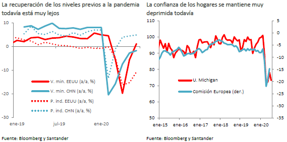 Datos de actividad de junio en EE.UU siguieron mostrando una tímida recuperación. Las ventas minoristas (7,5% m/m) y la producción industrial (5,4% m/m) estuvieron algo por sobre lo esperado, pero siguen en niveles muy por debajo de lo que tenían antes de la pandemia. En el mercado laboral, las nuevas solicitudes de subsidio de desempleo alcanzaron 1,3 millones en la semana, levemente sobre las 1,25 millones anticipadas. Para julio, el fuerte aumento de los contagios y la reimposición de restricciones de distanciamiento social podrían implicar un freno en la recuperación. De hecho, la confianza de los consumidores de la Universidad de Michagan retrocedió en el mes hasta 73,2 puntos, muy por debajo de lo anticipado. En este contexto, se comienza a discutir un nuevo paquete de estímulo fiscal.