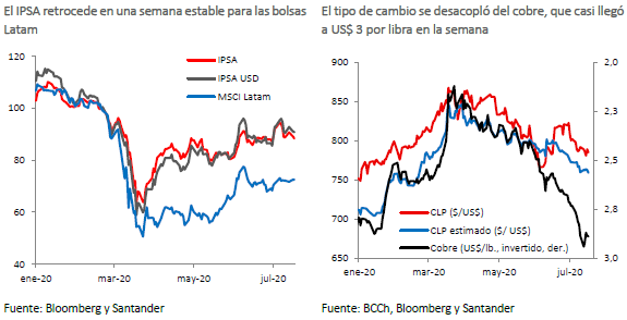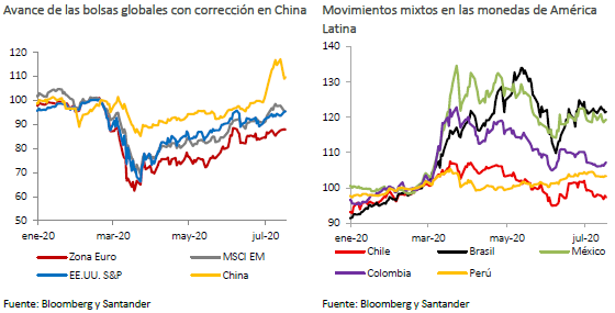 En Europa se publicaron pocos indicadores esta semana, aunque el optimismo por la reapertura se comienza a diluir debido a los rebrotes de la pandemia. En el aspecto monetario, no hubo mayores novedades: el Banco Central Europeo mantuvo las tasas de referencia en su reunión de julio y no anunció cambios en su programa de compra de activos.