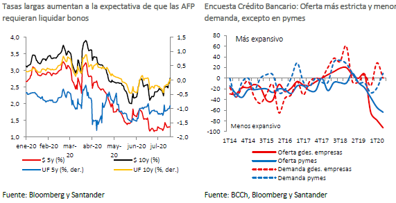 Durante la semana, el IPSA se movió a la baja, acumulando un retroceso cercano a 4% desde que se aprobara, en votación general en la cámara de Diputados, la reforma constitucional que permitiría el retiro de recursos desde los fondos de pensiones. Por su parte, las tasas de bonos aumentaron durante la semana, especialmente en los plazos más largos que subieron entre 20 y 30 pb. El tipo de cambio se ha mantenido estable durante la semana, algo por debajo de $ 790 por dólar. Esto, a pesar de que el precio del cobre alcanzó nuevos máximos pospandemia, llegando a cotizarse en cerca de US$ 3 por libra. Cabe destacar que, en el corto plazo, el impacto del retiro de fondos en el valor de la moneda podría ser ambiguo, ya que podría implicar una fuerte liquidación de activos mantenidos en el extranjero.